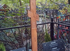 Могила стандартная, не большая. Когда-то здесь стоял гранитный памятник и была высокая ограда. После очередного захоронения плиту убрали в сторону, цветник тоже подняли, переднюю часть ограду демонтировали, установили временный крест.